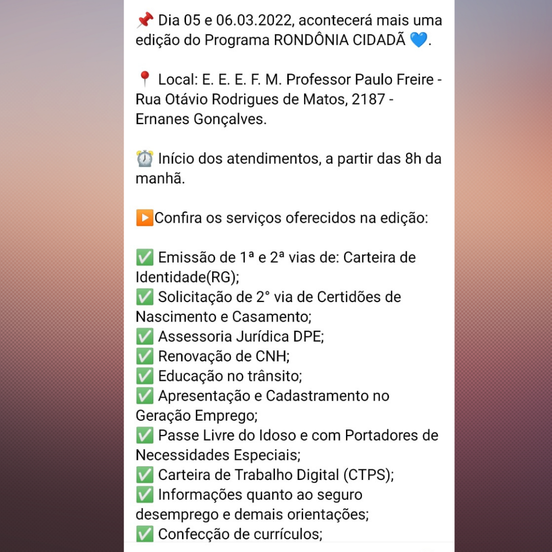 Atenção presidente médici, nestes dias 05 e 06 de março de 2022, acontece mais uma vez o Rondônia Cidadã, com vários atendimentos para população,
