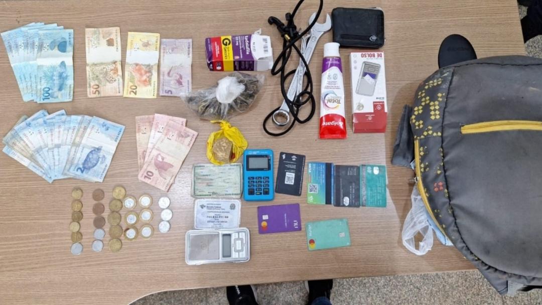 Ao perceber a presença policial, ele tentou se deslocar para a área de jogos do bar, mas foi abordado pela guarnição. Durante a busca pessoal e a inspeção de seus pertences, os policiais encontraram uma mochila contendo 30 porções de maconha, totalizando 66,8 gramas, além de 42,28 gramas de crack. Também foram apreendidos R$ 746,60 em dinheiro, uma balança de precisão e materiais utilizados para embalar os entorpecentes.